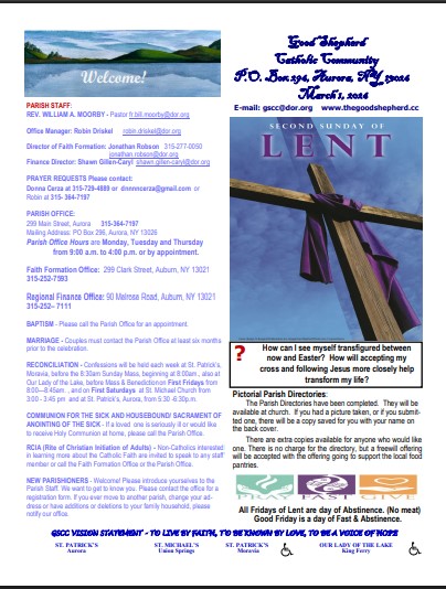 Welcome to Good Shepherd Catholic Community, a vibrant and loving Catholic parish serving the faithful across four beautiful worship sites: St. Patrick’s in Moravia, St. Patrick’s in Aurora, St. Michael’s in Union Springs, and Our Lady of the Lake in King Ferry.